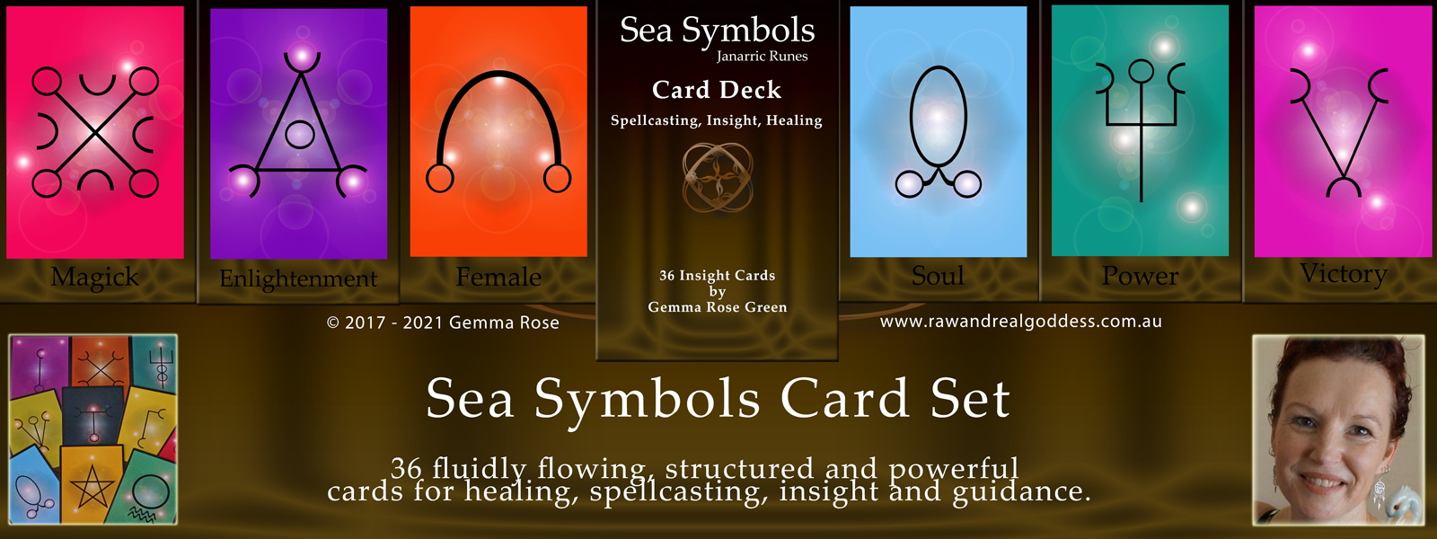 'As the ocean meets the land, the sea embraces the earth, and all is in love with the flow and evolution of the universe. The witches of the sea, and sea witches alike, created symbols, runes of the sea, to cast and craft spells. It is these sea runes that we connect with as the powerful symbols of the sea. It is these sea runes that we hold an affinity for, that we develop a deeper understanding for, and it is these sea runes, the symbolism and insight of the Janarric Runes, that hold the foundations of the Sea Symbols, creating a card deck consisting of 36 fluidly flowing, structured and powerful cards for healing, spellcasting, insight and guidance.'