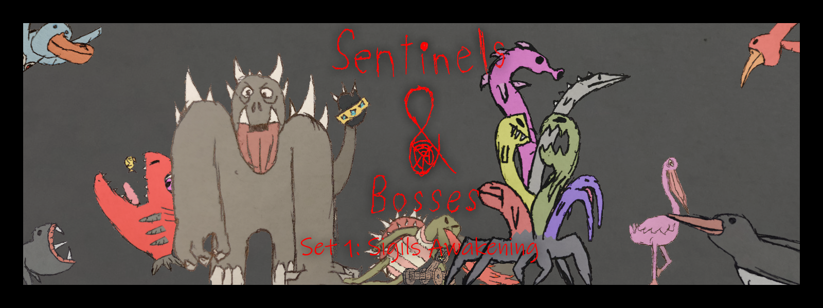 The Sentinels & Bosses TCG has 2 players using decks of 32 or more cards to slap and insult their opponent in turn based battle. You make your deck with Guards from 3 standings (Grounded, Submerged, Airborne) to protect your Boss (which starts on your field at the start of the game and has 2 different stages that your opponent must take down), Event cards which can effect the game in many ways, Item cards which you attach to Guards for multiple different funny little effects, and Location cards which stay on the field to offer multiple turns of support.