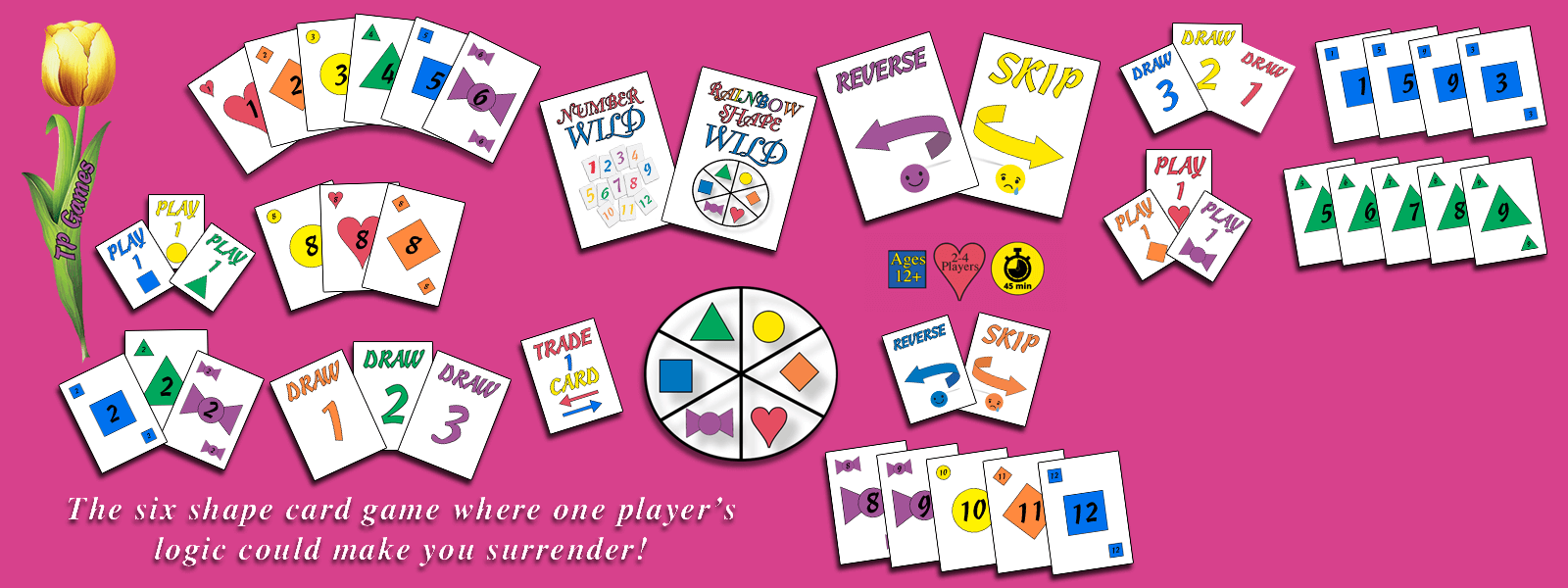A game where strategy and the remembering of colors and shapes will be on the forefront of gaining victory over your competitors. There are 6 different shapes with the numbers 1 through 12 and 27 specialty cards, making each game unique and challenging. The game is played in three round matches, whoever runs out of cards first ends a round. The winner is the person with the most table points; table points are accumulated by matching combos of shapes, colors, and numbers. Watch out for play cards because with them, "One Player's Logic Could Make You Surrender". You will have countless hours of fun mastering this game!