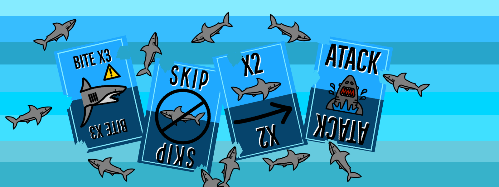 Shark attack is a family style card game that takes 15min on average. The goal is to either be the last one standing, or have the shark card in your possession by the end of the game. You can become the last player standing by using your cards to force other players to discard. And you can attempt to hold the shark card in your possession by using the cards in your hand to move the shark card between players. Will you survive the shark pit? Or will you get bit!