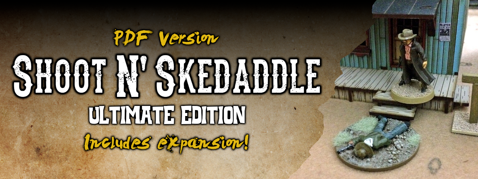 Disclaimer: Shoot N' Skedaddle is a wargaming rule set. It includes only the rules documents and necessary card decks for gameplayer. Players will be responsible for their own miniatures, terrain, dice and tape measures.