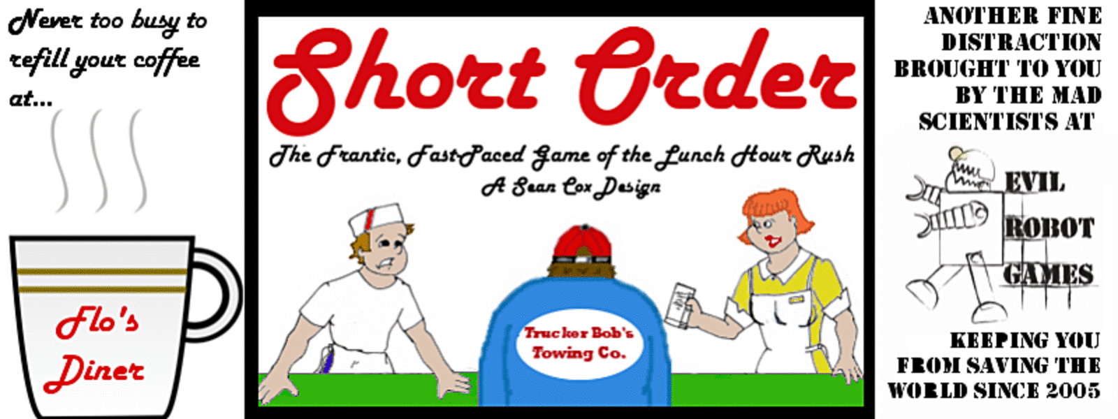 DING! Order up! It’s the lunchtime rush at Flo’s Diner and the place is packed. You and your fellow servers are busting hump to get customers their food and get them back to work. The short order cook sends out food as fast as he can make it, but the orders just keep coming. Your feet are killing you as you give the trucker in the corner his fifth free refill on his coffee when Flo herself calls you all together. Whoever serves the most customers this rush gets to go home early. Sounds like a dream come true, because Trucker Bob just finished his coffee and is eyeing you for yet another refill. Time to get out there and sling some hash.