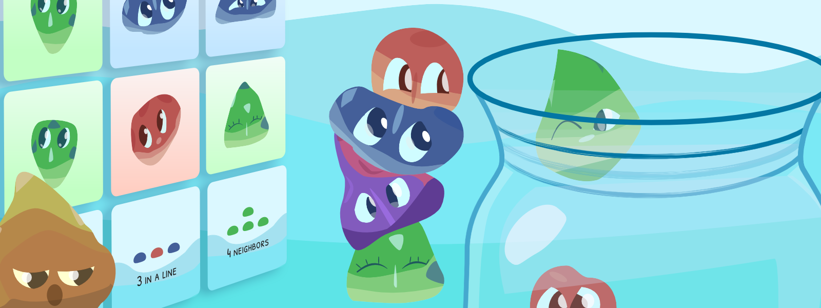 Slimes love bright colors and prefer sticking together. What could be more fun for them than a topsy-turvy party in a jar? You are welcome to participate and help them mix some extra vivid combinations!