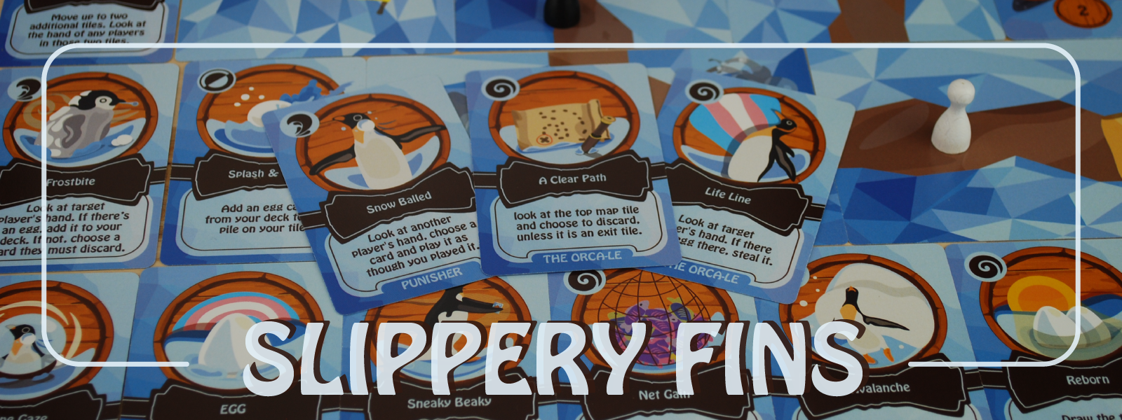 Slippery Fins is a simple but strategic deck-building game that emphasizes cunning and adventure while building out its labyrinthian icy maps. Like almost no other game out there, Slippery Fins' map tiles are irregular and encourage twisting, turning, and overlapping as you build out your deck through exploration, and gather those precious eggs.
