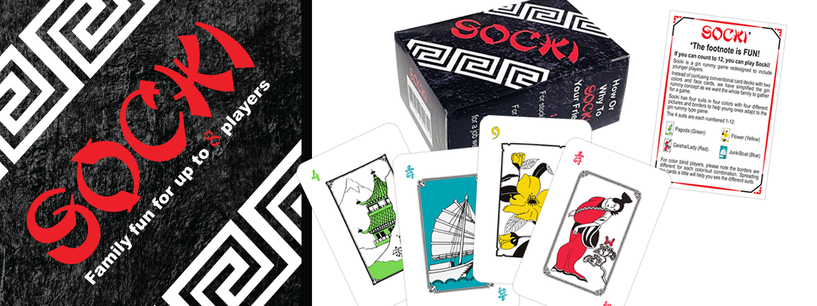 Socki is an open faced gin rummy game great for the whole family. Easy to learn but takes a lifetime to master. Players try to win a hand by playing all their cards. Once cards are played on the table all players can use them to play more piles of like cards or runs (number sequences) to also try to get rid of all their cards. The fun comes when the piles and runs are rearranged in a way to allow a player to play a card. But be careful if you cannot play a card after all that rearranging you must put it all back! Let the laughter and fun begin. For 2 to 8 players.