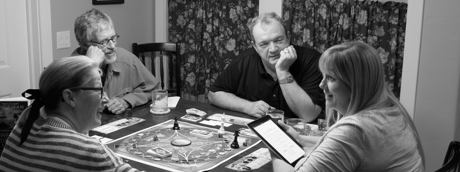 Sojourner Tales is a family board game of epic stories, twisted tales and destiny. Created and written by NYT Best-selling author and veteran game designers Tracy & Laura Hickman, this fast-paced game gives from 2-6 players a storytelling experience in genres of your choice. Fantasy, science-fiction, mystery, horror, steampunk, fairy-tale, romance, Western... Sojourner provides them all through our unique ability to download new game scenarios directly to your ereader device ... or write your own scenarios using our Sojourner system.