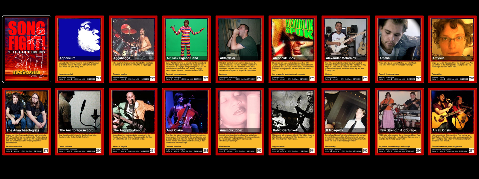 Pictures, Descriptions, Location, Fights Entered, Fights Won, Winning Percentages, Date of First Entry, and each band's Super Power.