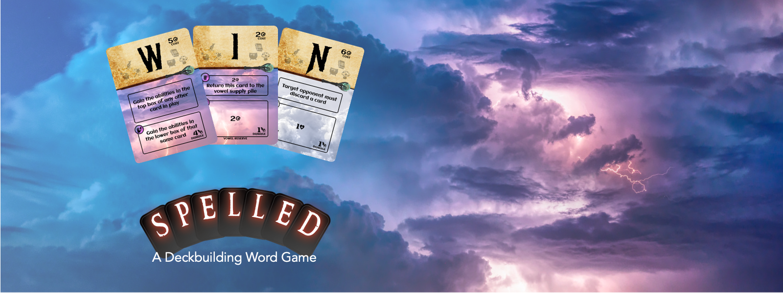 Spelled is a deckbuilding word game between two or more magic-wielding witches and wizards. Each of your cards is a letter that can be spelled as a word to deal damage and gain powerful abilities. But each spell can hit just one target – so longer words aren’t always the best bet, giving a fair fight even if your opponent is a loquacious wordsmith…