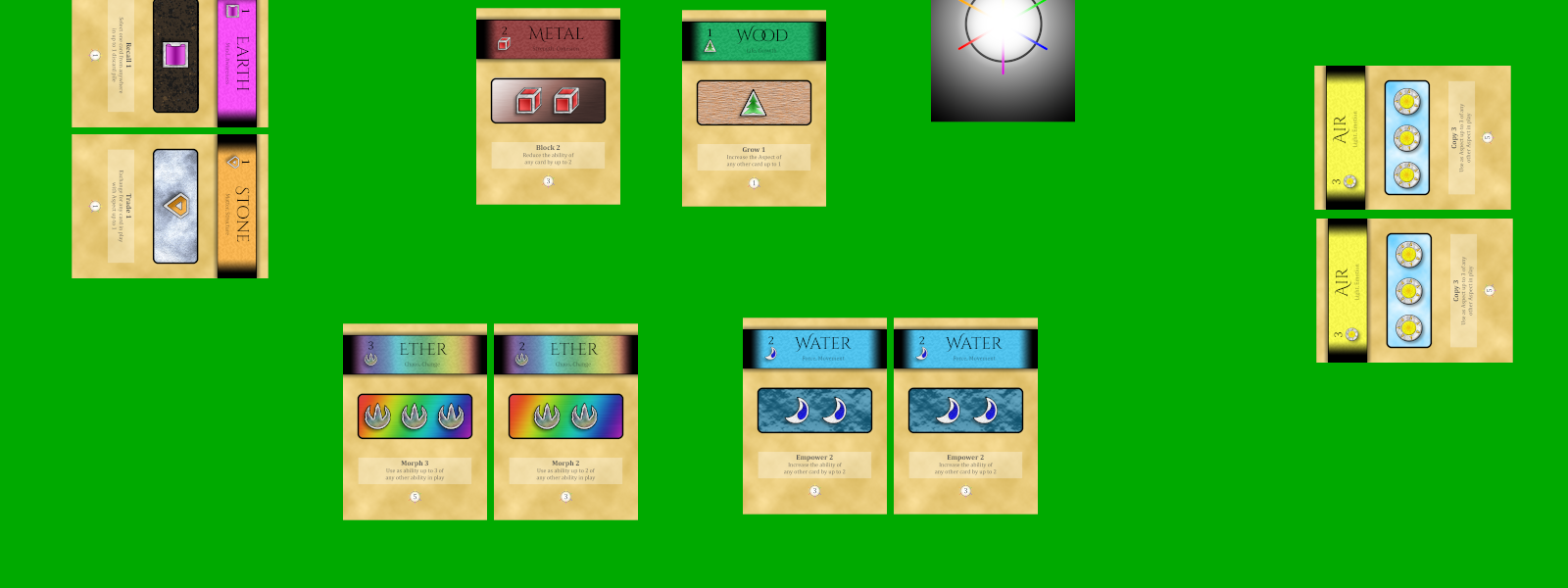 Each player maintains a hand of five cards, either from the Draw deck or the four discard piles. Place cards in your tableau singly or in pairs. Pairs of cards provide points at the end, based on the value of each card's Aspect.