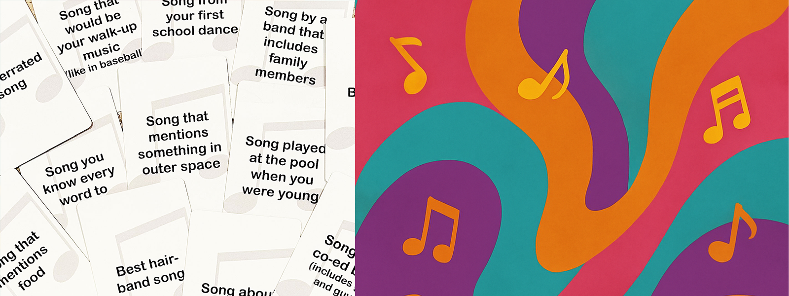 All you need is our Spin That Track card deck, a mobile device, and your favorite music streaming service. Just pick a card, have everyone think of a song that fits the vibe, and then add the songs to your playlist. The more rounds you play, the bigger your playlist gets.