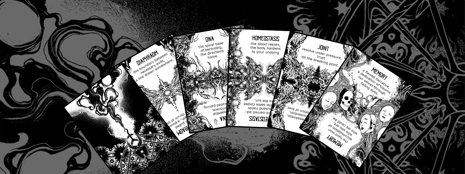 "The hope for this deck is to build a story that is intimate in a visceral way. It is intended to be a discomfort that marries story to self. Careful attention was paid to turns of phrase that deal with both the physical and metaphorical. In order to make the best use of the deck, it is encouraged that the player look not just at the connections made in the cards themselves, but in the connection - or disconnect - the player may have to their own body."