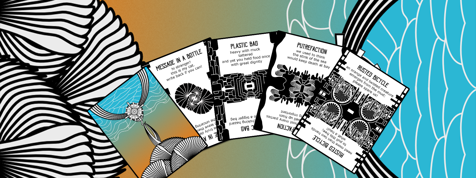 "The Tidewrack deck is a collection from the edge of land and sea. It draws from the beach, a place full of life and constant change, where dead things come to rest and lost things can be found again. Tidewrack is a deck about memories of the beach, but it's also about being trans, being an immigrant, and struggling to find a place to belong. Use it in play to bring the ocean, liminal spaces, and transition into your story."