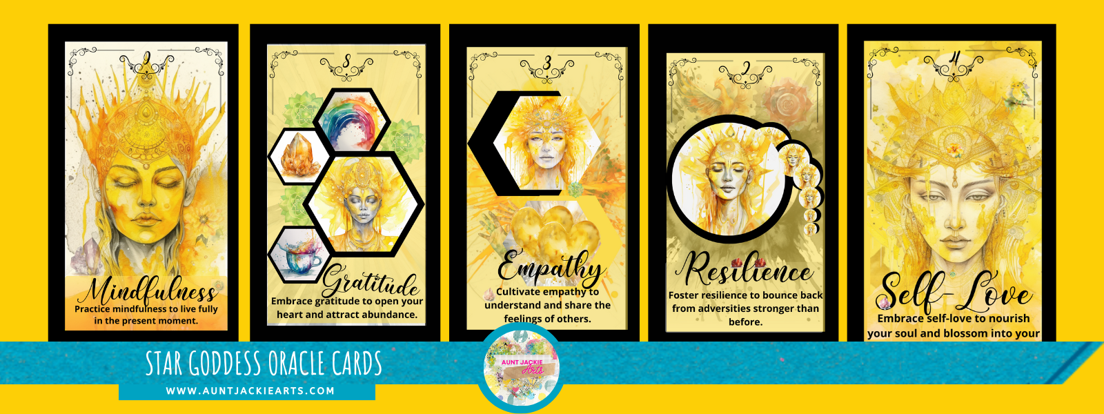 Each card features an exquisite watercolor image of a Star Goddess, resplendent in brilliant yellow hues that symbolize wisdom, clarity, and joy. Every Goddess has a unique name and offers insightful advice, sharing her ancient wisdom and guidance to help you navigate various aspects of your life.