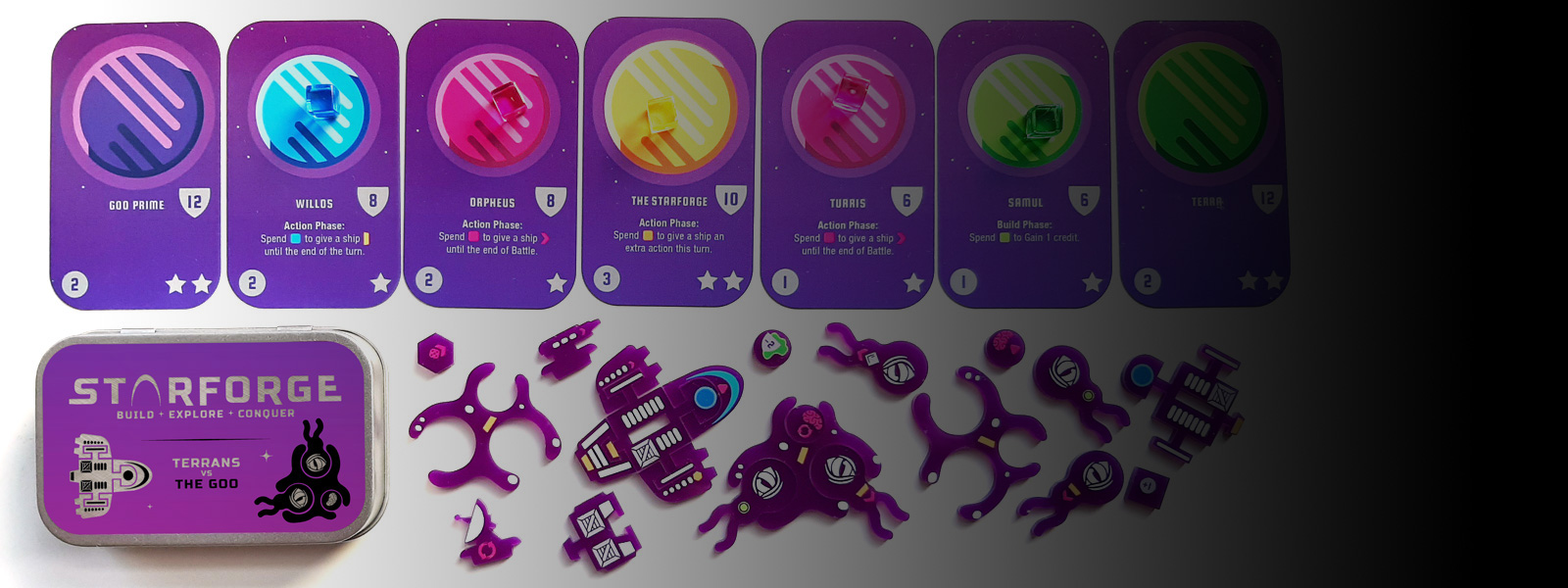 In Starforge, each player starts with an asymmetrical faction of constructible ships made from custom acrylic game pieces. In the center of the table is a row of location cards that can be conquered and mined for resources. Through their choice of tactics, and how they build their ships, the players can battle and outwit their opponent, achieving victory by command points, resource capture or enemy destruction.
