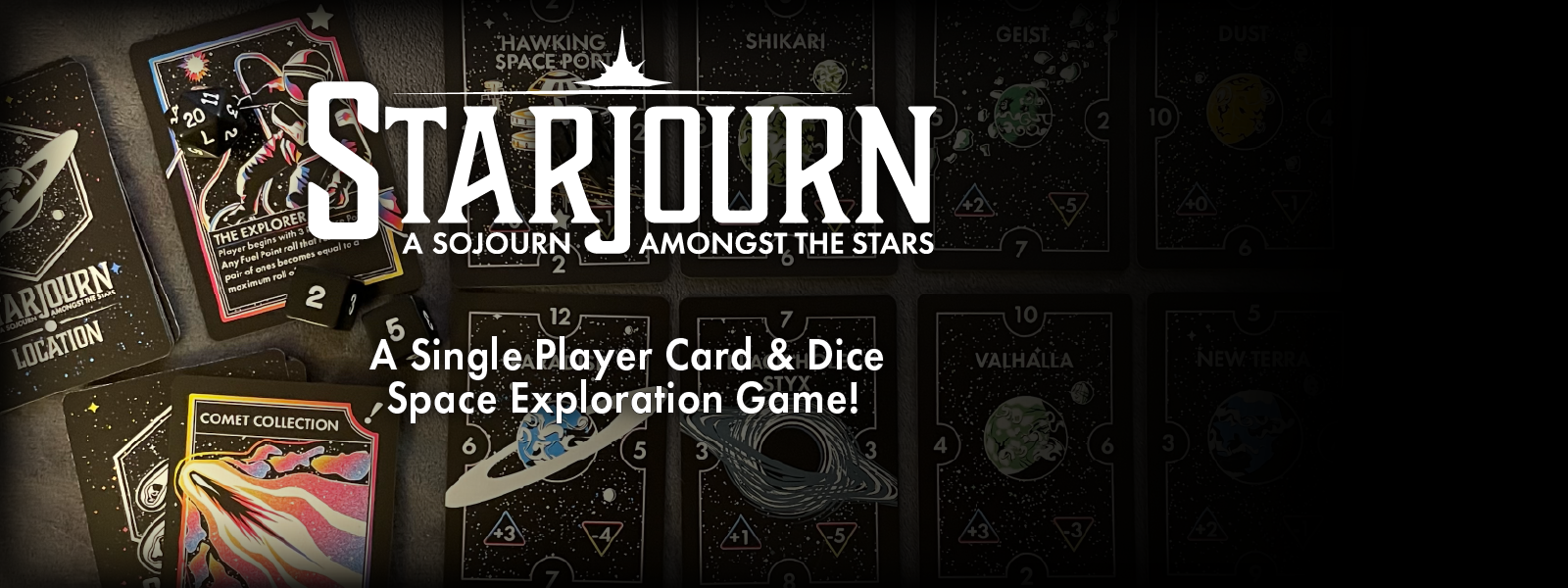 STARJOURN is a single player card & dice game where you aim to explore an alien star system, collect resources, and return with it all in one piece. In a fun game of chance, risk, and skill, you will journey through the mysterious voids of space to new worlds whilst facing extraterrestrial events. Every game is unique as you chart a new path each play through. Travel across the stars and wager your strategy against the odds to win it all!