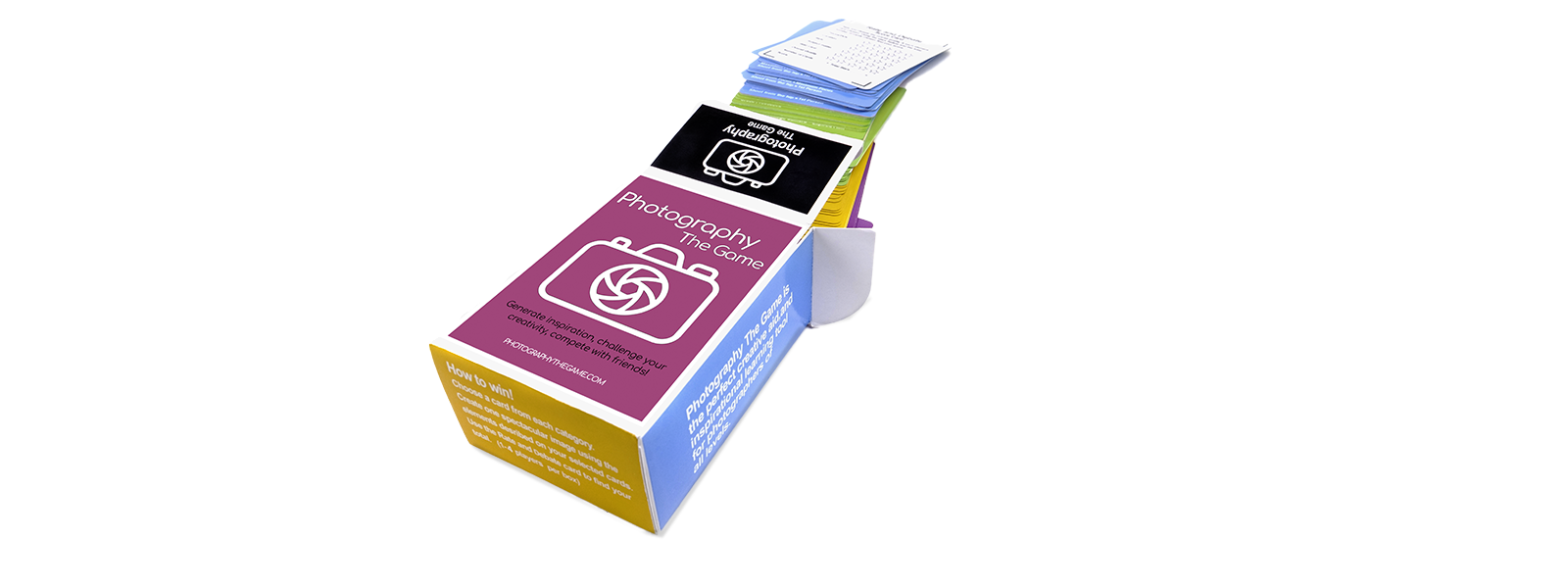 Photography The Game was developed to focus and exercise your creativity and can be played two ways. The first by helping you to generate ideas and concepts. Basically it is an excuse to create something you would have probably never considered! Second Photography The Game is also a way of adventuring, competing and leaning with friends! Using the Rate and Debate cards friends can rate and challenge each other to see who can take the best images using the selected cards to make one or a series of amazing images. Perfect for photo adventuring!