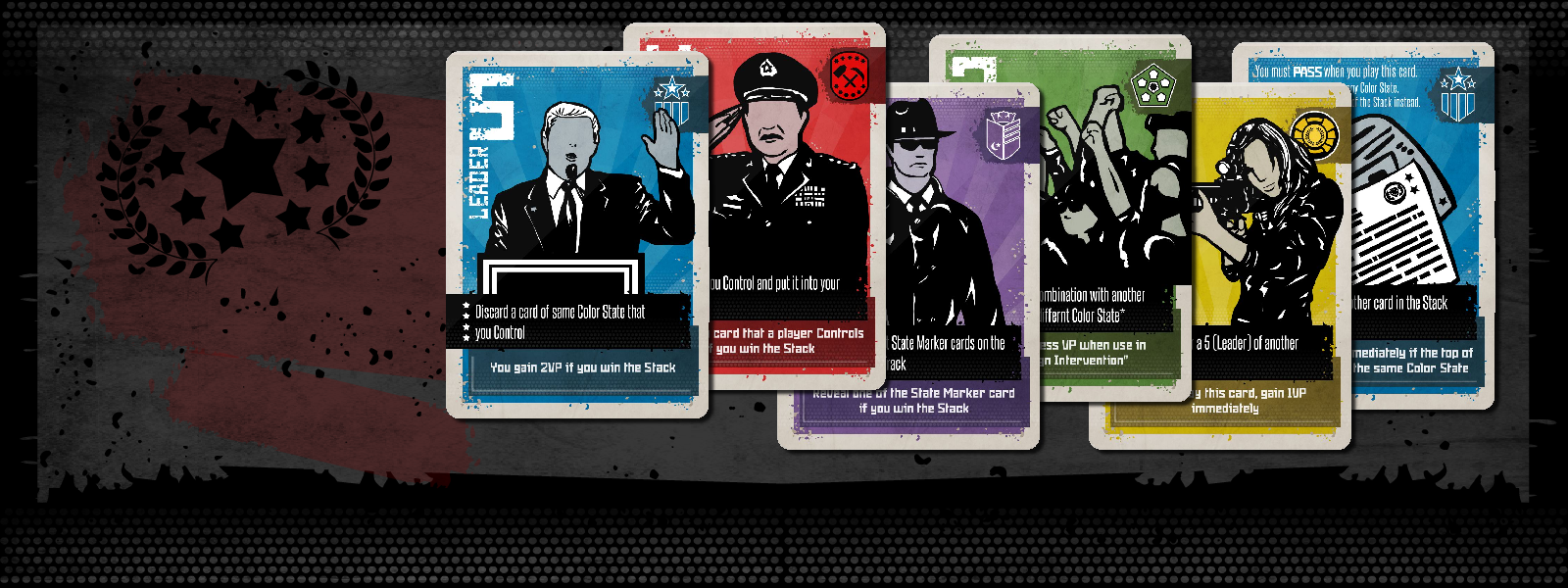 * Deal out cards * Place States Marker cards on the Tracker card as hidden end-game score modifier. * All players peek at one of the State Marker cards. * Start the round. First player play a card, enacting any ability or effect on it. * Follow player either play a card that can Overpower the last played card, or pass. * Cards’ abilities help manipulate and manage your hand, winning cards, and State Marker cards. * Player who passed draw a new card. * If all but one player passed, that player wins the pile. They will play a new card and start a new round. * Game continues until all the cards from deck run out. At the end of game, reveal the State Marker cards and what each color would gain/loss. * Count up the total points, and determine the winner!