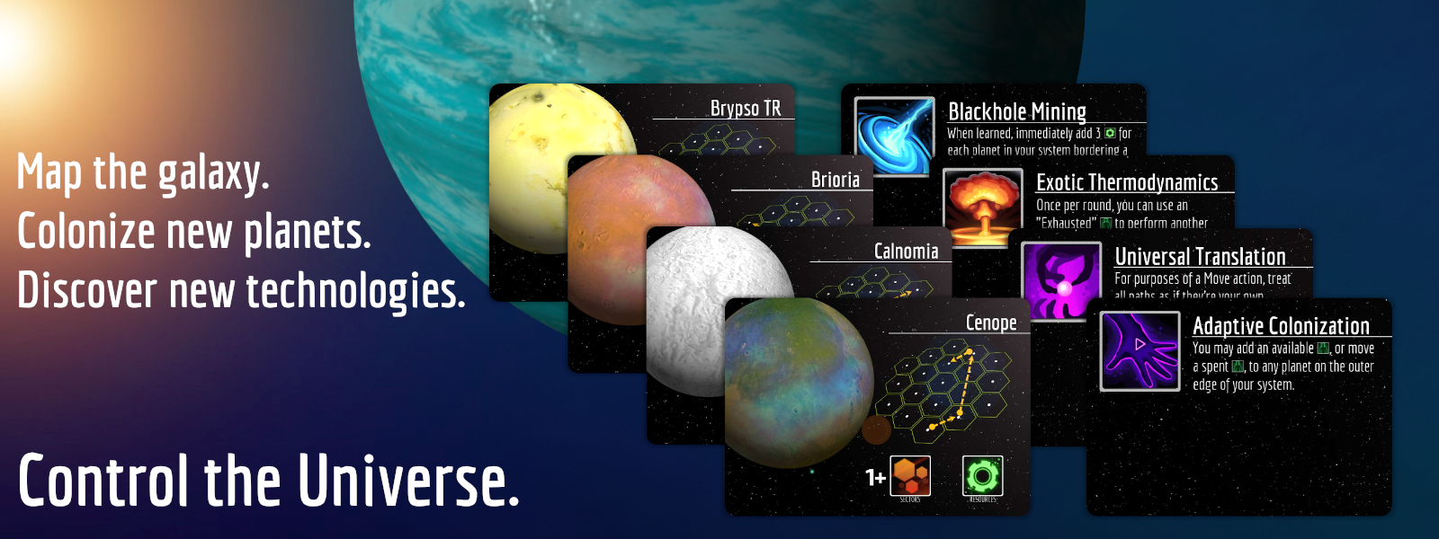 Exploration | Blackhole Mining | When learned, immediately add 3 Resources for each planet in your system bordering a star. And, during subsequent Chart actions, earn 3 Resources for each planet charted adjacent to a star. |