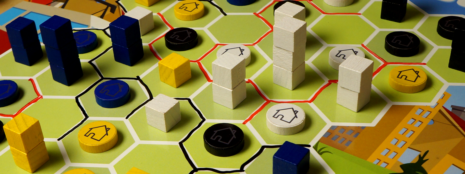 Players remove single-family housing limits from the board and place building cubes on the empty spaces, then draw streetcar lines directly onto the board with dry erase markers. Each house you take scores 1 point per building cube of the same color connected to your streetcar line. But, the houses you leave on the board will control the color and height of the new buildings, so you must choose carefully to maximize your score.