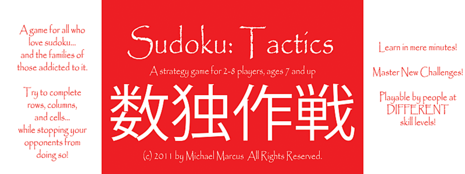 Sudoku Tactics is the first true competitive game played on a sudoku board. Players take turns trying to complete rows, columns, and cells while stopping their opponents from doing the same thing. Built with a steady-state design in mind, any number of players can play, although two to eight players work best. Play to a time limit (until it stops raining!) or to a point score (for tournament play)--this game fits YOUR needs. It even includes "handicap" rules to balance the game for new players!