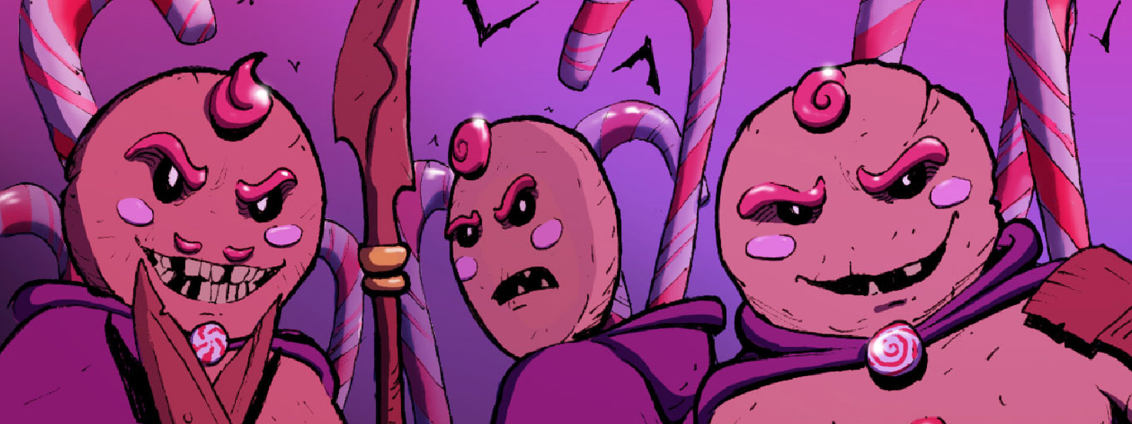 Along the colorful candy road players will face off against sweet and salty enemies using a D-20 based combat system that applies both the player and enemies' Attack, Defense, and Health Points.
