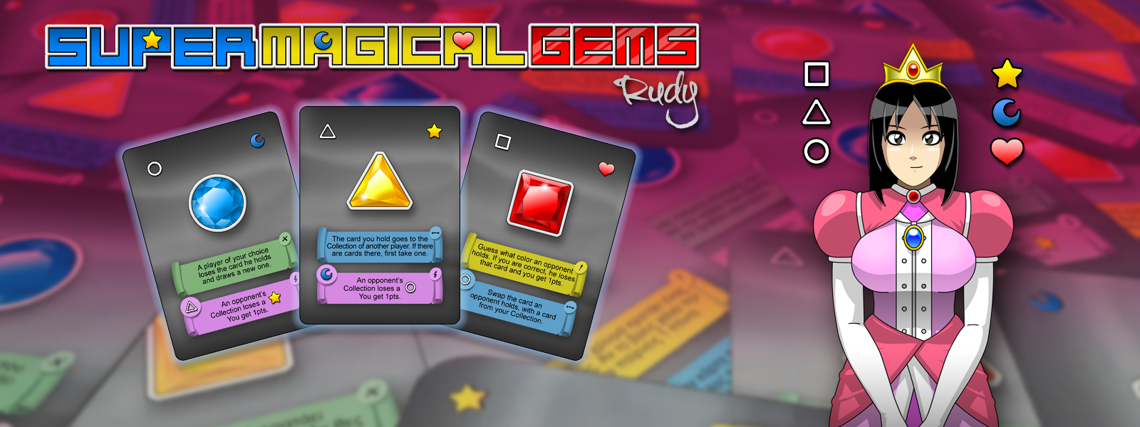 Super Magical Gems is a simple and light card game. The players try to earn points by collecting sets of Gems. When a Gem is played, a Normal or a Combo effect gets activated, which may give additional points or the chance to destroy the opponent‘s plans! As each player's Collection changes in every round, everyone's priorities and tactics have to constantly adapt!