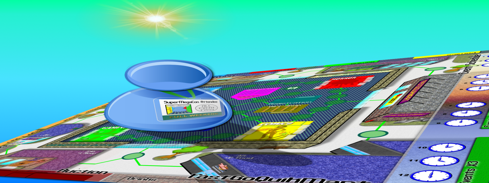 During SuperMegaCan you can do all this: Grab Swag and attend Events in our exclusive SciFi, Gaming, Horror, and Comics areas. Visit our lovely Gift Shop for items that will make this convention the best ever. Need a quick break? Run to FastGoQuikMart for Snacks and Drinks. Be sure to get enough rest at one of our convenient area Hotels. Eat at fine area Restaurants and our own Snax Bar. Catch the Auction where you can get tons of Swag or extra Cash. Visit our Registration booth to sell your own Swag to other Attendees. Enjoy Special Events in our spacious Auditorium. Need extra cash? We're always looking for Volunteers ....and Much, Much, More!!