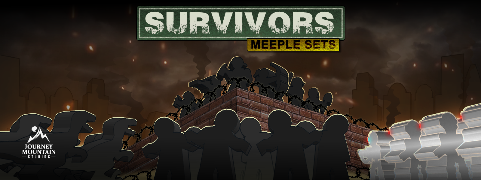 The Survivors Meeples Set includes 27 Survivors: a Katana Survivor, Chainsaw Survivor, Landscaper Survivor, Ballplayer Survivor, Hockey Player Survivor, Burglar Survivor, Golfer Survivor, Sniper Survivor, Archer Survivor, Enforcer Survivor, Rancher Survivor, Hunter Survivor, Mercenary Survivor, Anarchist Survivor, Doctor Survivor, Scientist Survivor, Construction Survivor, Firefighter Survivor, Mechanic Survivor, Cop Survivor, Cook Survivor, Farmer Survivor, Janitor Survivor, Guy Hiker Survivor, Gal Hiker Survivor, Guard Dog, in Blue Acrylic. Each figure is about 20mm tall and 6mm thick.
