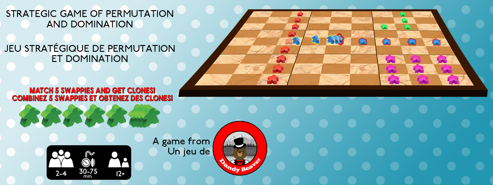 Swappies est un jeu de permutation et de domination pouvant être joué par 2, 3 ou 4 joueurs. Ce jeu de stratégie est joué sur une grande planche de jeu contenant 81 cases dans une grille de 9X9. Il y a 2 façons de gagner; être le dernier joueur à avoir perdu tous ses swappies ou mettre ses 49 swappies sur la grande planche de jeu.