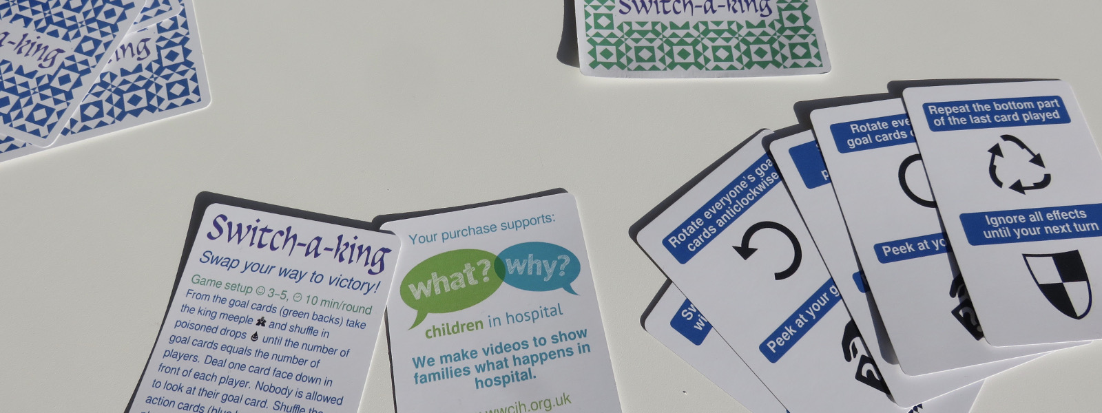 From the goal cards (green backs) take the king meeple and shuffle in poisoned drops until the number of goal cards equals the number of players. Deal one card face down in front of each player. Nobody is allowed to look at their goal card. Shuffle the action cards (blue backs) and deal each player 4 cards for 5 players, 5 cards for 4 players and 6 cards for 3 players. Any leftover cards (green and blue) are not used this round. The player who is dressed most royal starts the first round.