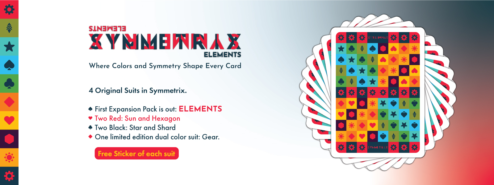 This Symmetrix: Elements Deck includes all 9 unique suits, each with 14 cards (Ace to King), and 9 special Jokers—one for each suit. This full deck expands on the original four suits, adding new ones like Sun, Star, Hexagon, and Shard, plus the limited edition dual-color Gear suit, making it perfect for games with more players or custom rules.