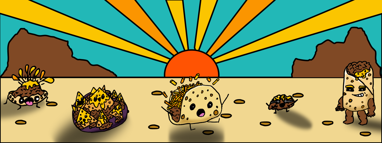 Each Tacorama card lists a meal that can be made from a certain ratio of ingredients, shown in the top left corner of each. The ingredients are tortilla, cheese, and beef, going from top to bottom. On each card, the first present ingredient is the base and must be singular, and other ingredients are expressed in whole number increments relative to the first. Every card is unique and there are a total of 31 cards.