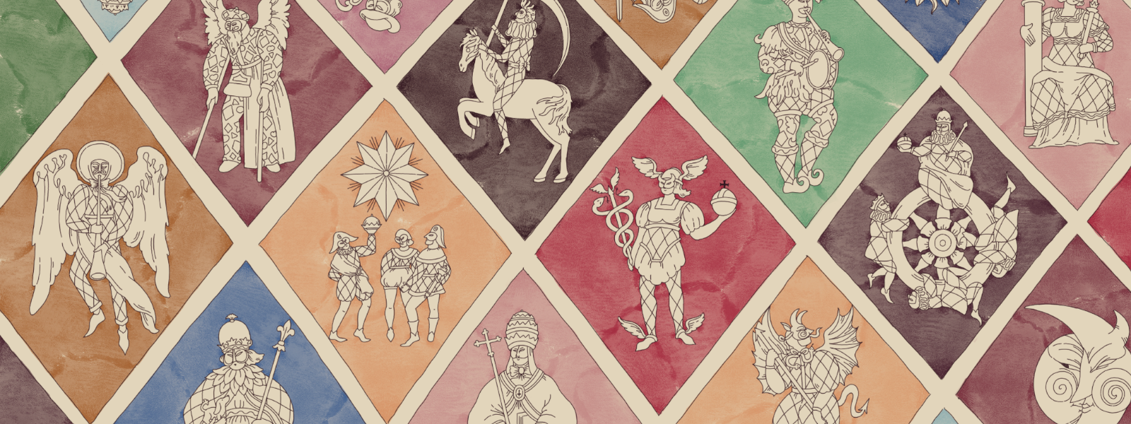 Tarocchino Arlecchino is a 64-card “little tarot” dedicated to the mischievous Arlecchino, a.k.a Harlequin, a.k.a. Erl-King. The deck is modeled after the 62-card Tarocco Bolognese (a tarot deck with numbers 2 through 5 removed from each suit). Each card is printed with upright and reversed divinatory meanings based on the Etteilla system.