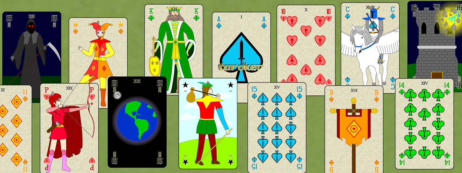 Each of the 4 card suits has an individual color, to avoid revokes. The added 11 - 15 ranks, banner, and princess cards for each card suit helps match the Tarot Trump ranks. A lot more cards means a lot more people can play poker. The design for the classic Jack, Queen, King courts cards are based on the Parisian Patterns of the French Playing Card deck.