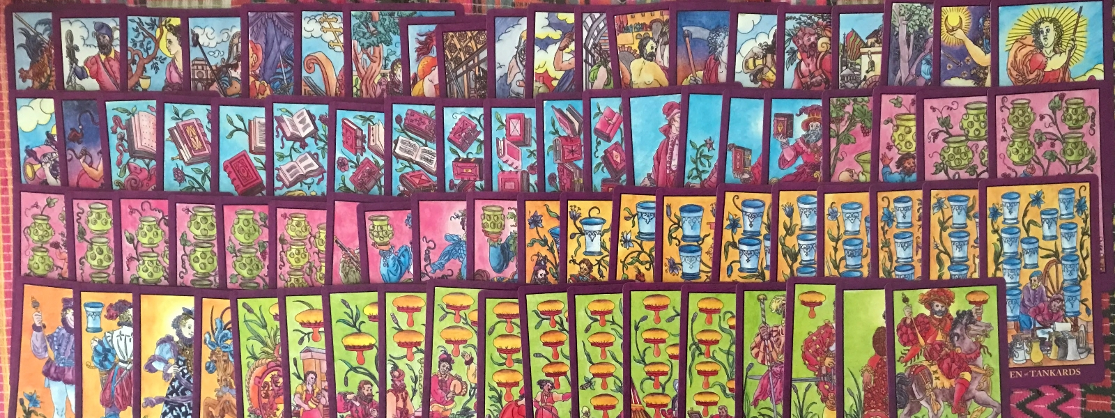 As a prolific artist, there are plenty of extant images from Jost Amman to form a major arcana for this deck. This follows in the footsteps of card artist Catelin Geofroy who, some 30 years previously, added his suit of trumps to the cards of Virgil Solis, a deck recreated by this designer in the "Tarot of Geofroy & Solis". As per the designer's usual style, the images have been carefully traced and hand coloured in watercolour pencil in a modern style.