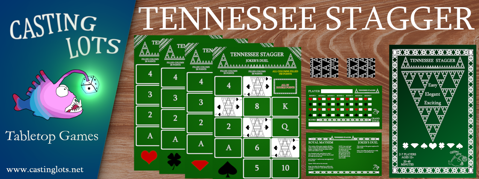 TENNESSEE STAGGER is just what you need. An elegant, casino style card game with a twist. It is very quick and easy to learn, but the stakes feel high. Place your bets on the suit(s) of your choice; will you play it safe with spreading out your potential to win, or will you reap the high rewards of going all in? Match your cards on the game mats to fill columns, earning precious points that propel you to the winner's circle.