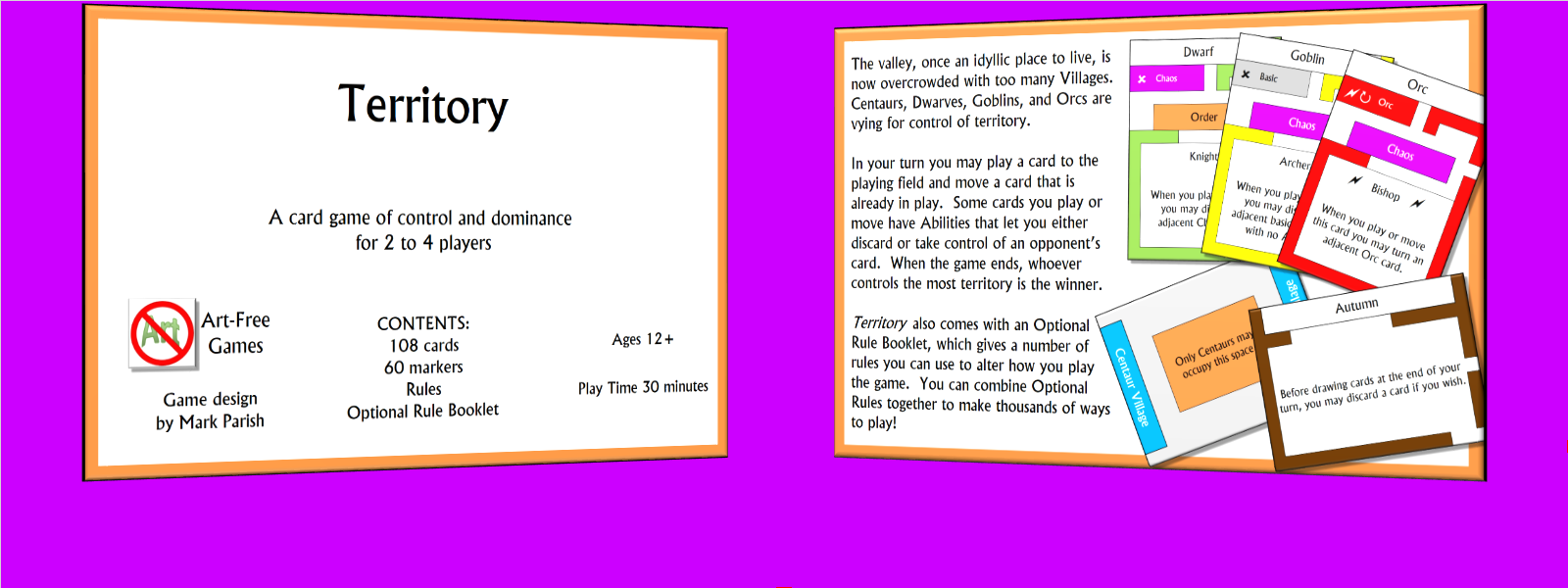 In your turn, you may play a card to the playing field and move a card that is already in play. Some cards you play or move have Abilities that let you either discard or take control of an opponent’s card. When the game ends, whoever controls the most territory is the winner.