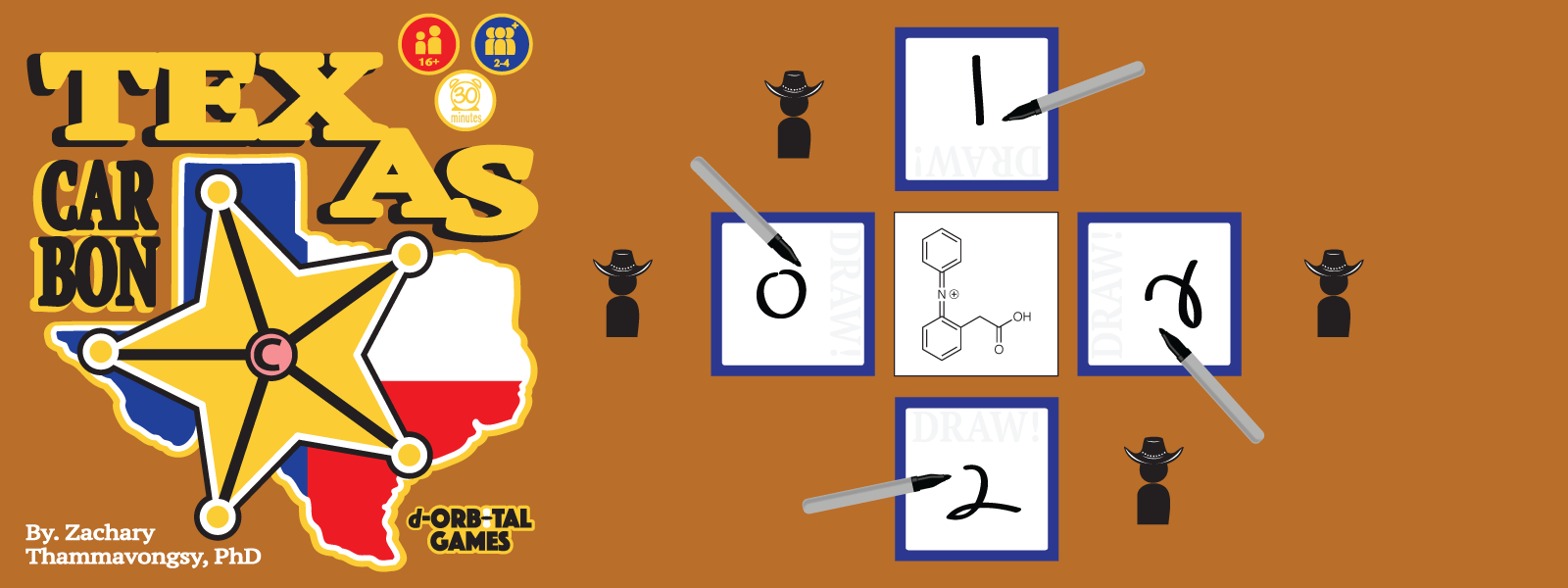Everything is bigger in Texas, even their carbon atom. Texas Carbon is a game designed for students who are beginning their adventure in organic chemistry. Players test their molecular structure identification skill by locating all the Texas Carbons (carbons with 5 covalent bonds) in the molecule shown on the Structure Card. Players must beat each other by being the first to write (DRAW) the number of Texas Carbons on their Draw Card that correspond to the molecule on the Structure Card. Welcome to a fast pace, quick draw game fit perfectly for an organic chemistry classroom showdown.