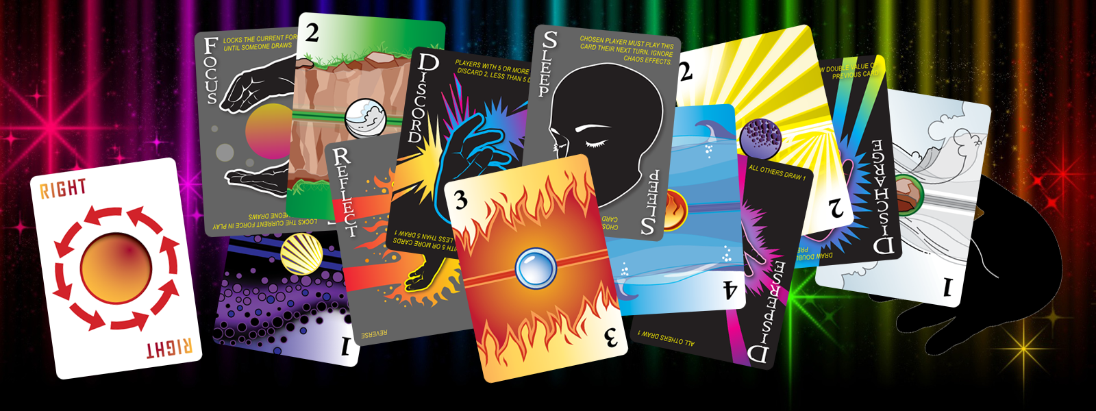Play Chaos cards to change the Force in play at any time. Most have additional effects as well. Disperse forces all other players to draw a card. Dispense allows you to hand out cards to opponents from your own hand, though you must draw an equal number to replace them. Discharge forces the next player to draw double the number of cards. Discord allows players with too many cards to discard a couple and players with only a few cards to draw an extra. Lastly, Dispel allows the player to call a particular Force and all players may discard those cards.
