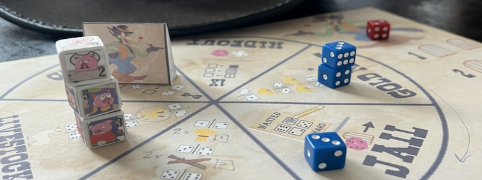 Players will each need 3 dice in one color per player to play. The Big Bad Wolf Sheriff will also need 1 die. The rest of the game: player sheets, rondel action sheet, and standees will be included in the printable material.
