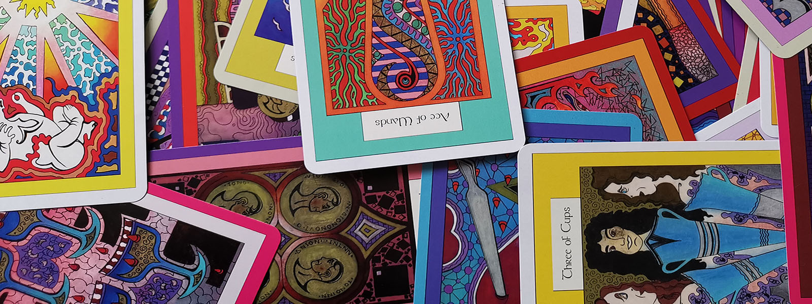 Each card was hand-drawn and individually designed using pen, ink and colour pencils on cards, with a vibrant palette of rich colours ranging from green, blue, purple, red and white. The colour and patterns fit the symbolism of each card. For example, reds and oranges correspond to the fiery Wands, whilst blues and pale yellows are more symbolic of Swords and Air. Tear shapes and waves correspond to Water and Cups, whilst Brick patterns go with Earthy Coins, or Disks. However, this deck is not purely abstract, but largely figurative. The traditional interpretations for each card are loosely followed, but interpreted according to the ideas and research pursued by the artist. The full in-depth set of interpretations have now been made available in full book form with an alternative jumbo-sized version through this shop.