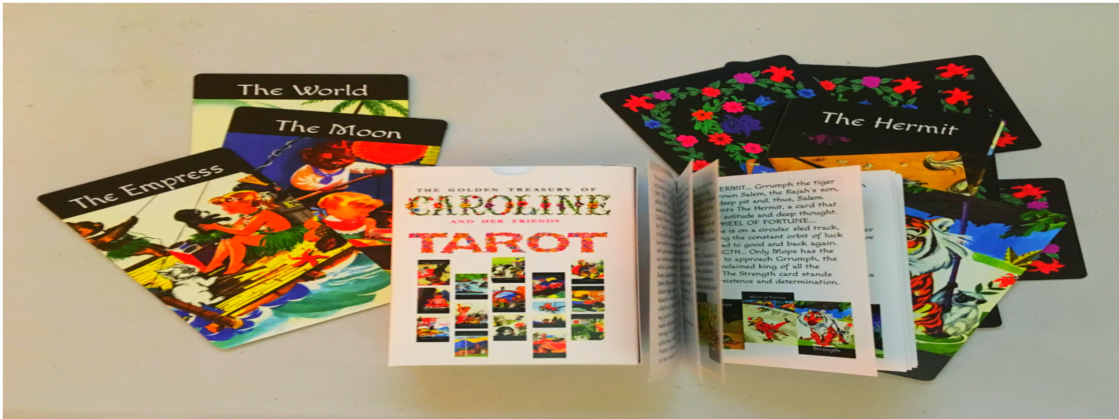 The series of Caroline books by French cartoonist Pierre Probst (1913 - April 12, 2007) made its debut in 1953, but the crown jewel volume was, inarguably, "The Golden Treasury of Caroline and Her Friends," now out of print and in the public domain. This book has resold for upwards of $1,000 with good reason. The illustrations are charming and the storyline, in which Caroline and her friends Rusty, Leon, Bruno, Inky, Pouf, Spots, Mops, and Bobi travel to distant lands, is captivating. Raised in a home with an extensive collection of books, this volume was my favorite of all my childhood reads, and when I looked at it through the eyes of a Tarot aficionado, I saw that several of Probst's drawings lent themselves to the creation of a deck. This deck of full-size Tarot cards comes in a colorful box with full color booklet. Meanings for each of the 78 cards, in the context of the storyline and artwork, are fully detailed.