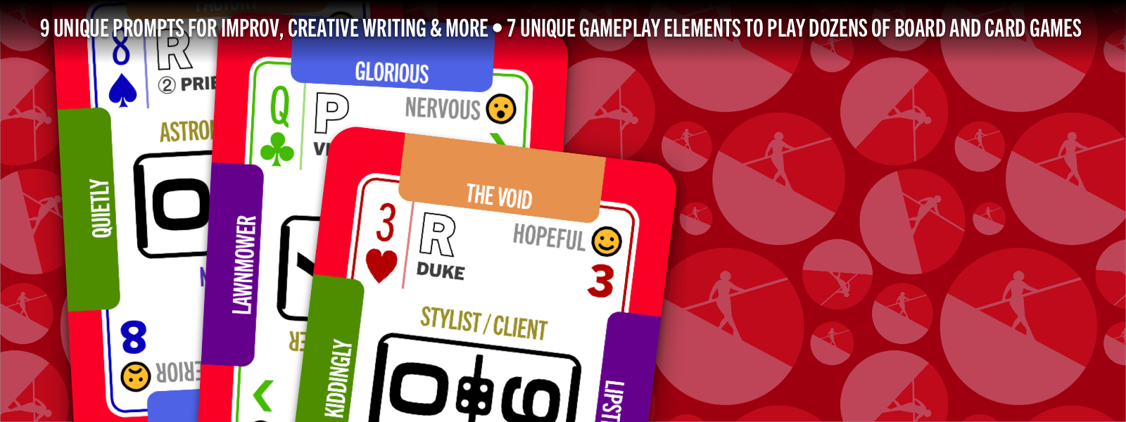 The Highwire Deck is a new modular improv toolbox and gaming system from Highwire Improv and Pacdude Games. Use the Highwire Deck for improv practice, writing inspiration, creative brainstorming and more, and play dozens of your favorite card and board games all in one concise package.
