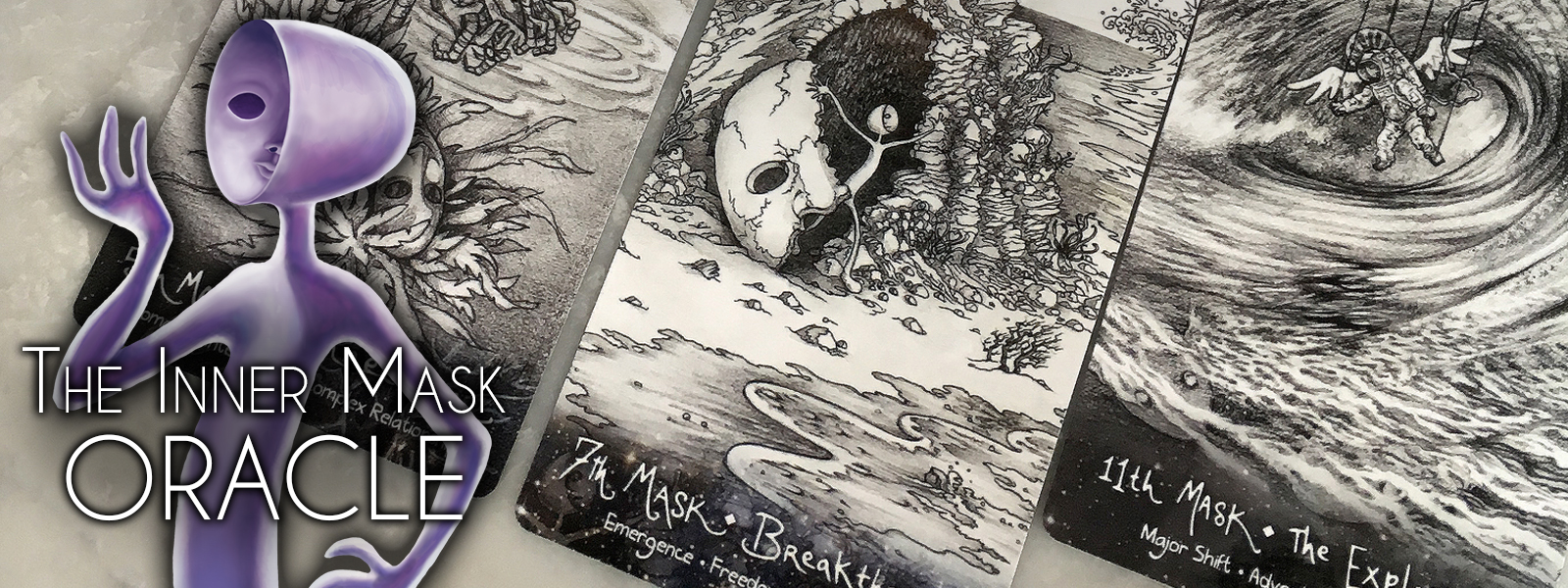 The Inner Mask Oracle Deck is a greyscale oracle deck drawn by Kathleen Kralowec (Kat Crow). The deck features various characters wandering a surreal zone that is part super-natural, part subconscious, part shadow realm, and the scenes depicted help a reader interpret their reality, and hear what the shadow-self is trying to say.
