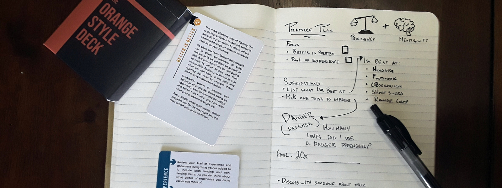 THE ORANGE STYLE DECK breaks down my fencing style into just over 50 principles and includes suggestions of how to work on each of them. My goal was to create a tool that could define my style, help me teach it, and grow as I continue to gain experience.