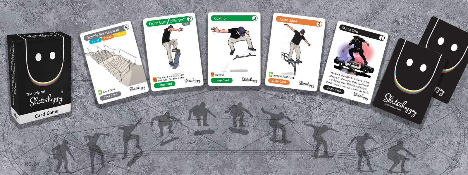 Every player starts with five cards, and they are dealt face down. There are three chances to exchange cards and improve your game. To win the game, players combine compatible cards to create a Skateboarding trick, the trick with the highest score wins the game.