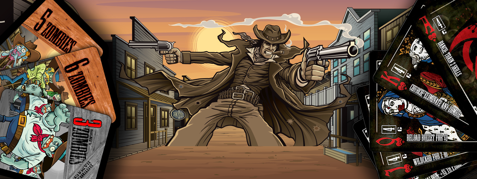 The gunslingers are protecting the last seven bastions of hope. Should these bastions fall, the zombies win. If you are the last gunslinger left standing and you survive one final round of zombie attack, then you are the winner. You take the purse and head out of town!