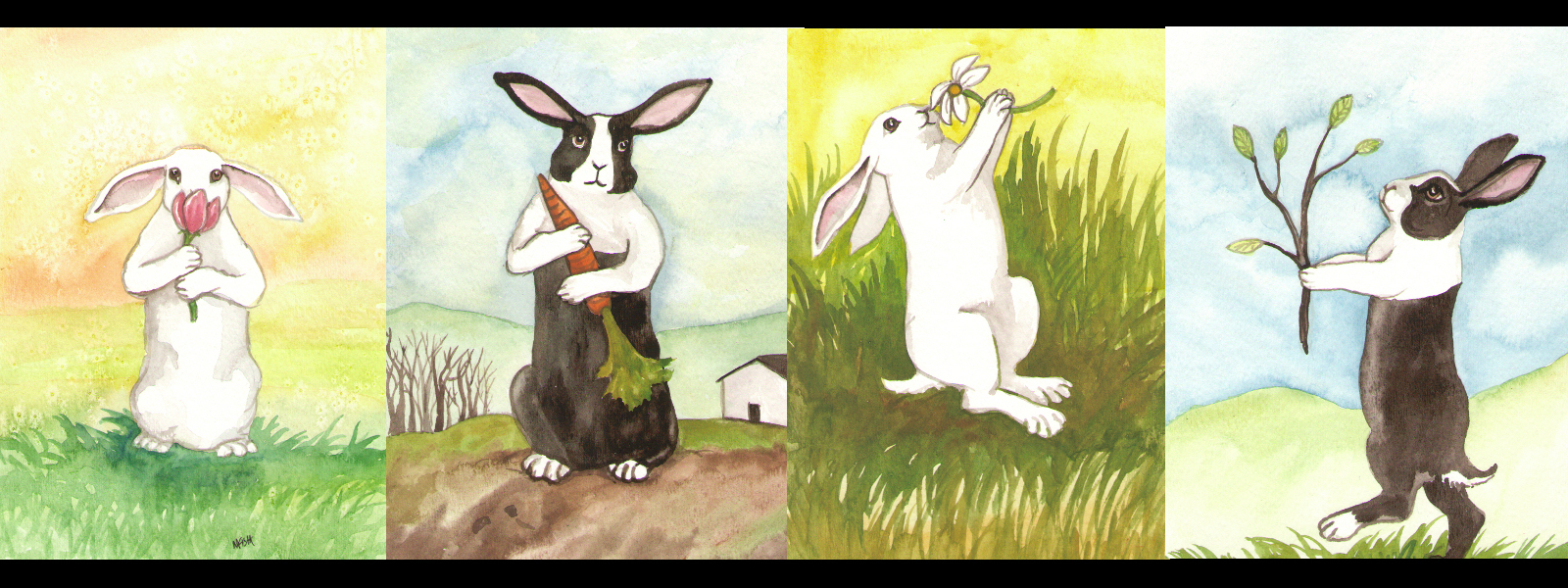The Rabbit Tarot features the Little White Rabbit and the Dutch (black and white) Rabbit. Instead of pentacles there are daisies, instead of swords there are carrots, tulips are cups and sticks are clubs.