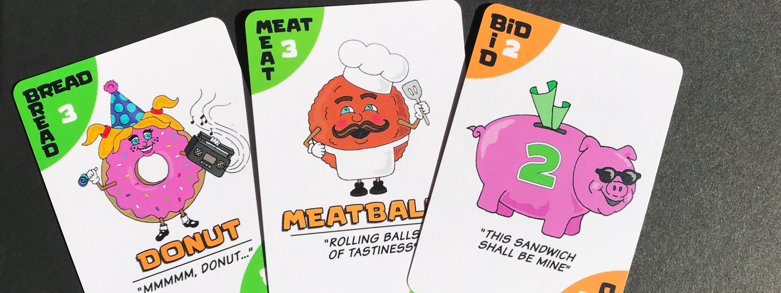 Work as a group to build community sandwiches then bid as individuals to see who eats each sandwich. Be the champion by eating the most delicious sandwiches, or just have fun by making your opponent eat road kill and rotten tomatoes between two moldy croissants. But beware! Your opponent might completely change what's happening by throwing down a special napkin card at the last moment!