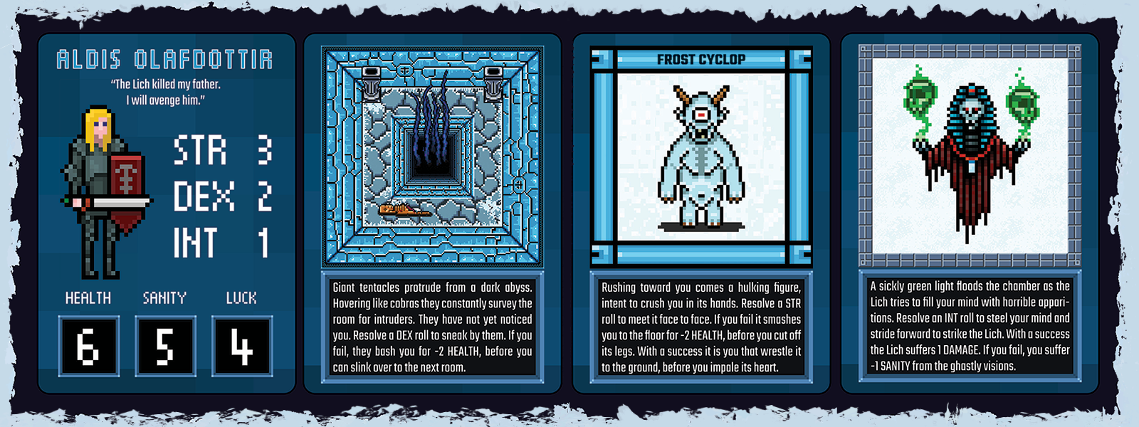 The Tower of the Ice Lich is a fast, simple, solo-adventure dungeon card game. It is created as a homage to 16-bit video games, fantasy RPGs, and classic Sword and Sorcery literature. Choose between 4 different characters, face multiple challenges in the form of 30 unique rooms and 30 distinct events, and acquire 12 marvelous items that help you on the way to defeat the Lich and its 9 special attacks. Replay and experience a different tower the next time. Or why not use the cards as inspiration when you need a quick dungeon for your regular RPG session.
